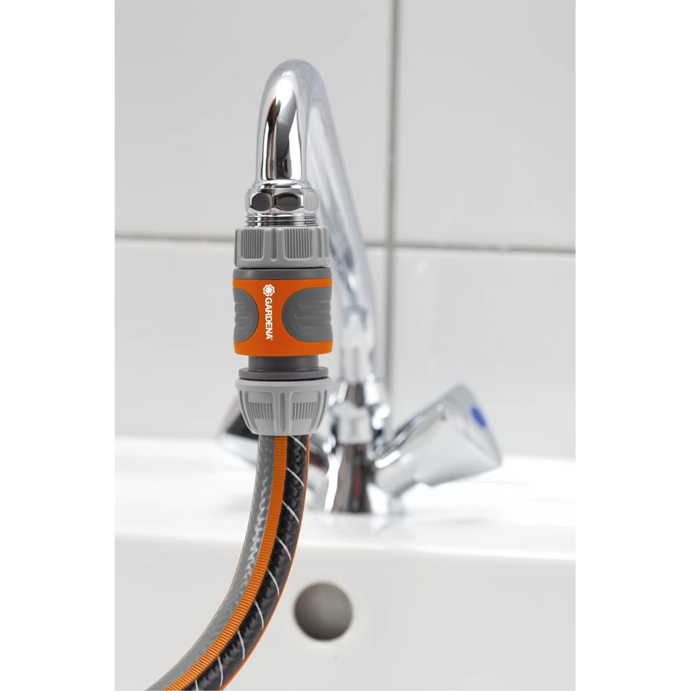 De GARDENA System set snelaansluitstukken bestaat uit een GARDENA kraanstuk (Art.nr. 18201), een slangstuk (Art.nr. 18215) en een draadadapter (Art.nr. 2906). Deze set maakt een snelle verbinding mogelijk tussen een kraan met bruiskop (bijv. in keuken of badkamer) en de tuinslang.