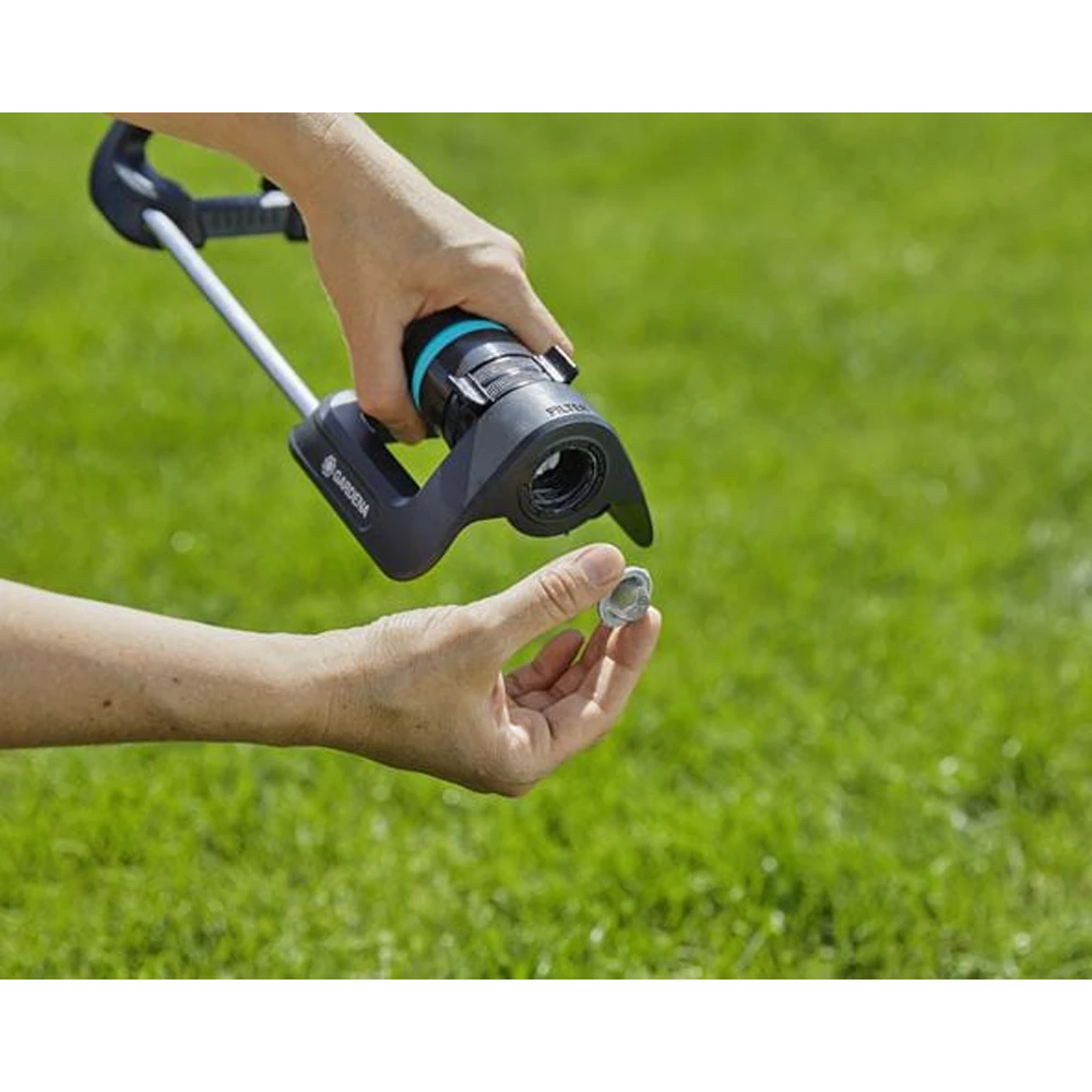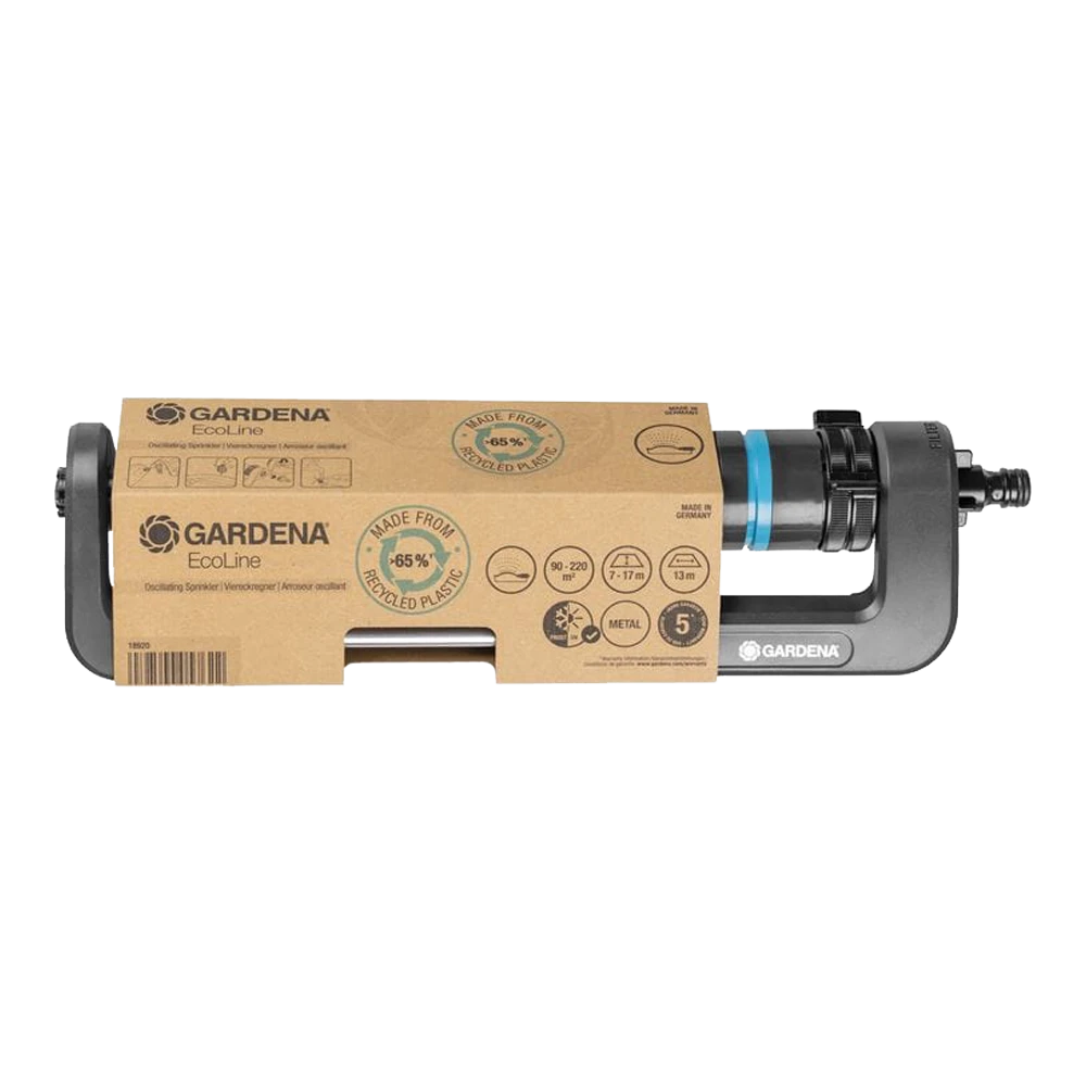 De EcoLine Zwenksproeier van GARDENA bewatert rechthoekige gazons of bloemperken van 90 tot 220 m² nauwkeurig en gelijkmatig, zonder dat er plassen ontstaan. Deze zwenksproeier, ontworpen met kunststof vervaardigd uit meer dan 65 procent gerecycled materiaal uit huishoudelijk afval, biedt de duurzame oplossing om uw gazon op warme zomerdagen te bewateren. De aluminium buizen van de sproeier bevatten meer dan 25 procent gerecycled materiaal. De gebruikte metalen elementen versterken de stevigheid en duurzaamheid van de sproeier en geven hem een stijlvol uiterlijk. Plaats eenvoudigweg de zwenksproeier op uw gazon, koppel een tuinslang aan de kraan, en zet de kraan open. Vervolgens kunt u het bereik van de sproeier gemakkelijk van 7 tot 17 meter aanpassen. De EcoLine vierkante sproeier heeft in breedte een bereik van maximaal 13 meter. Met de vierkante sproeier kunt u zowel een smal bloemperk als uw hele gazon sproeien. De zwenksproeier is uv- en vorstbestendig en u kunt hem dus het hele jaar door buiten laten. De sproeier heeft nog een handige en slimme functie waarmee de duurzaamheid wordt onderstreept: een ingebouwd, uitneembaar filter voorkomt dat de sproeier door vuildeeltjes verstopt raakt. Dit filter is gemakkelijk te verwijderen en eenvoudig onder de kraan schoon te maken. Als de sproeier verstopt raakt door kalk, kunt u de gaatjes met de meegeleverde reinigingsnaald gemakkelijk schoonmaken. De EcoLine Zwenksproeier wordt in Duitsland vervaardigd en de kwaliteit wordt door GARDENA ondersteund met vijf jaar fabrieksgarantie. Een natuurlijke keuze voor tuiniers met passie. ReTh!nk – De nieuwe EcoLine serie. Verantwoord geproduceerd. Esthetisch ontworpen. Duurzaam vervaardigd.