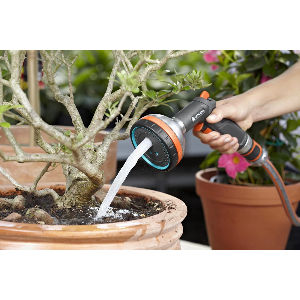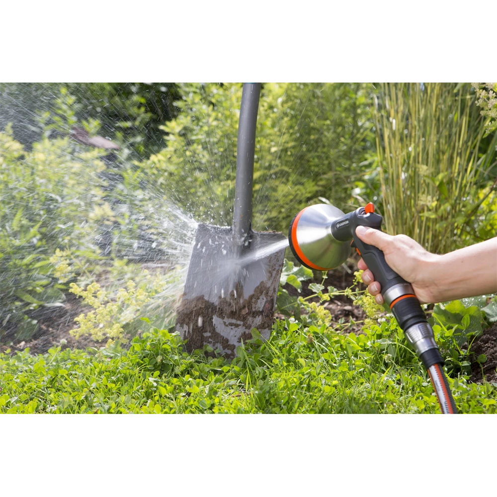 De GARDENA Premium Multi Broes is ideaal voor alle bewateringsklussen dankzij de 5 verschillende straalsoorten. De nevelstraal is perfect voor het bewateren van zaaigoed. De zachte straal of broesstraal zorgt ervoor dat de bloembedden goed kunnen worden bewaterd. De harde straal is voor reinigingswerkzaamheden. De Premium Multi Broes is voorzien van metalen componenten op de sproeikop en het verbindingsstuk waardoor het product zeer duurzaam is. De ergonomische handgreep zorgt voor optimaal gebruikscomfort. De waterstroom kan traploos worden ingesteld. Voor langdurige sproeiwerkzaamheden kan de impulshendel met de geïntegreerde knop worden vastgezet. Het filter kan worden verwijderd en schoongemaakt. De Premium Multi Broes beschikt bovendien over geïntegreerde bescherming tegen vorst.